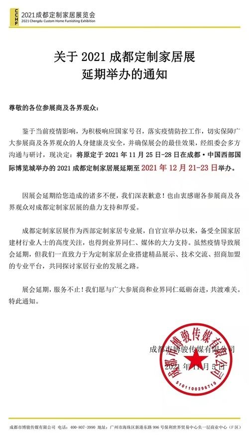 2021成都定制家居展组委会发布通知称,因疫情防控原因,原定于11月25-28日在成都·中国西部国际博览城举办的“2021成都定制家居展”将延期至12月23-25举办。