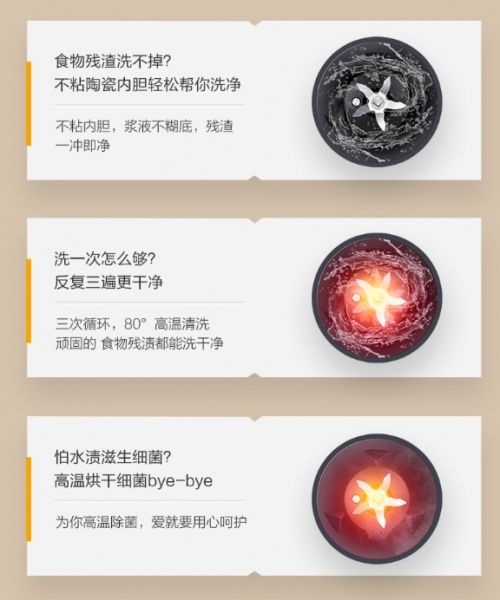 美的全自动破壁机采用全方位高压冲洗杯体,通过高速搅洗带走杯里的残渣和污渍,在全方位高压冲洗杯体后,还会进行三次循环80度高温清洗,洗完后还会自动热烘干燥除菌,不仅干净还卫生!从此再也不会因为清洁不彻底而不敢用,也不会因为清洗太麻烦而懒得用了。