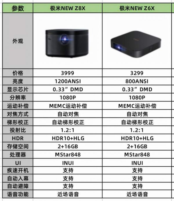 通过参数表,其实这两款投影仪的差别就呼之欲出,在外形上极米NEW Z8X在外观上会比极米NEW Z6X饱满,极米NEW Z6X的外形扁平,像一个便携式电脑小主机;就价格上两者也相差不小;亮度上,极米NEW Z8X的亮度为1200ANSI流明,极米NEW Z6X的亮度为600-800ANSI。