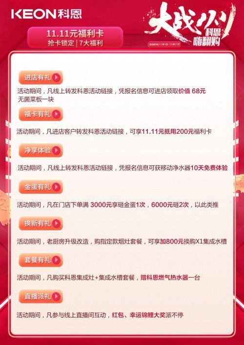 大战双11,科恩嗨翻购,11月1日——11月11日活动期间,前往科恩全国门店提前抢购11.11元福利卡,就能提前锁定7大福利。进店有礼:活动期间,凡线上转发科恩活动链接,凭报名信息可进店领取价值68元无菌菜板一块;福卡有礼:活动期间,凡进店客户转发科恩活动链接,可享11.11元抵用200元福利卡;净享体验:活动期间,凡线上转发科恩活动链接,凭报名信息可获移动净水器10天免费体验;金蛋有礼:活动期间,凡在门店下单满3000元享砸金蛋1次,6000元砸2次,以此类推;换新有礼:活动期间,老厨房升级改造,购指定款烟灶套餐,可享加800元换购X1集成水槽;套餐有礼:活动期间,凡购买科恩集成灶+集成水槽套餐,赠科恩燃气热水器一套;直播派礼:活动期间,凡参与线上直播间互动,红包、幸运锦鲤大奖派不停。