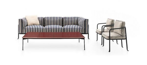 沙发坐垫的面料是这个系列中不可分割的重要一环。昔日经典的条纹帆布设计,唤起了人们对航海的联想。其配色亦丰富多彩,从海军风格的蓝白色和自然色调的白色,到深邃的灰色和清新的蓝绿色。“海边躺椅”条纹面料与纯色细条纹面料均可自由组合。饰边有白色、蓝色、灰色、蓝绿色和红色可供选择,赋予了衬垫的定义,同时也提供个性化定制。