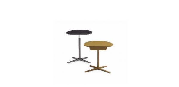 桌子由不对称的四辐压铸铝底座支撑,底座延伸到托盘的前部,形成自然流畅的形状,这种均匀的曲线在移动旋转托盘时也得以保持。支柱中隐藏了一个灵活的活塞结构,由环形螺母调节。这样可以轻松选择高度,从最矮56厘米到最高68.5厘米。