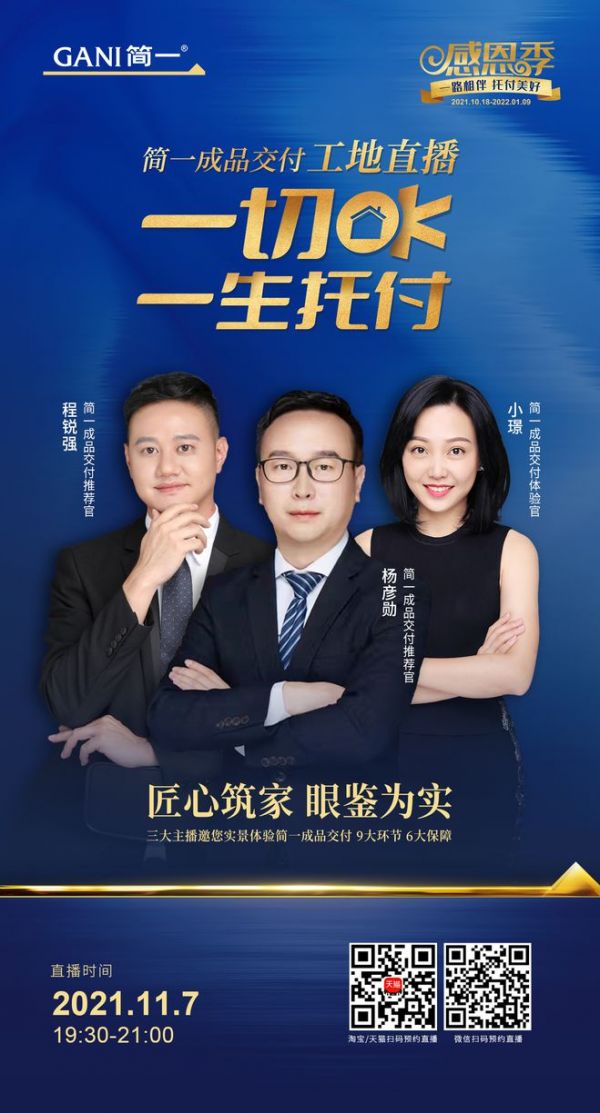 11月7日19:30-21:00,简一将在天猫、视频号与网易家居三大平台开展“成品交付工地直播”实景展示与“切片式”讲解成品交付全流程,揭晓核心工艺,并邀请简一成品交付推荐官现场讲解装修5大痛点,从售前、售中、售后全方位解决客户的顾虑,实现所得超所见,同时邀请品牌挚友,以真诚、透明的开放姿态一同聊聊装修中遇到的难题,并给消费者在装修中支招。