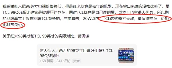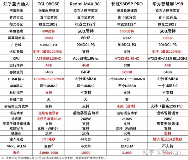 目前,TCL、红米、华为等品牌都有推出自家98英寸的智屏产品。不过根据知乎行业大V——蓝大仙人的建议来看,似乎是TCL 98Q6E IMAX Enhanced巨幕智屏这款产品最值得购买。