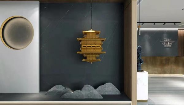 磨石的墨墙上,一个土黄精巧的雅亭吊于墙上。利用对称性的美学,对材料和表面处理,整体流动着庭内建筑的质感。顶部一点灯光和背景对应衬托,无形间对感官进行校准,感受着古色的格调。
