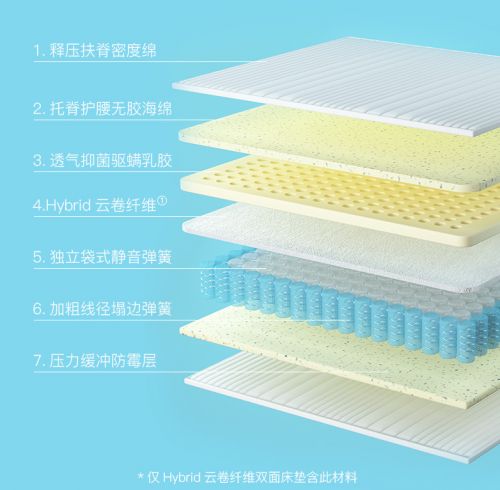 38年专注脊椎健康团队研制,云卷AB双面床垫从上往下分别为释压护脊密度绵、托脊护腰无胶海绵、透气抑菌驱螨乳胶、Hybrid云卷纤维、独立袋式静音弹簧、加粗线径塌边弹簧、压力缓冲防霉层。不同材料层支撑力和功能各不相同,科学护脊,不同体重的人睡上去也能紧贴支撑,享受舒适好睡眠。