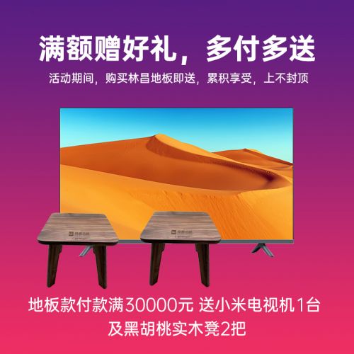 最后,林昌在这里提醒您,整个活动期间,只要您购买了林昌地板,包括小米电视机在内的各式的感恩好礼,即买即送,累积享受,上不封顶!