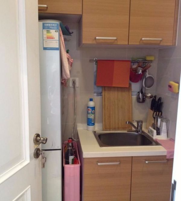 比巴掌还小的厨房,装修还费了不少钱,平摘菜、切菜都只能在外面切,可以说是非常艰难了。