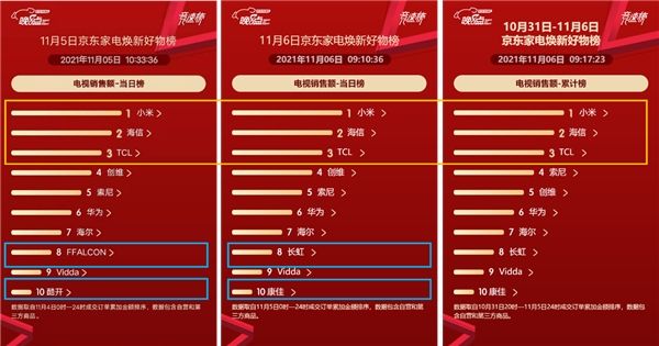 全品类主战场激战正酣,各品类的分战场上也是硝烟四起。冬日将近,室外的寒冷让宅家娱乐成为休闲首选。能刷剧、观影、玩游戏的电视自然成了热门产品,其销售榜魁更是各电视品牌的必争之位。小米实力稳定,始终占据当日榜、累计榜榜首,可谓是得人心者得天下。海信与TCL紧随其后,分别位列亚军和季军。FFALCON和酷开不敌其它品牌攻势,被挤出榜单之外,分别由长虹和康佳取而代之。