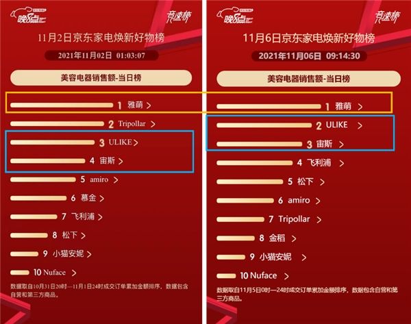 除了具有高颜值的家电深受喜爱外,能够让大家颜值提升的美容电器也备受青睐。有颜又有料的雅萌自京东家电11.11开门红至今一直表现亮眼,稳坐冠军之位。ULIKE和宙斯经过4天的蓄势待发,分别上升一位,坐稳了第二名与第三名的宝座,Tripollar则跌出前三甲,其后能否稳步挺近,有待观察。