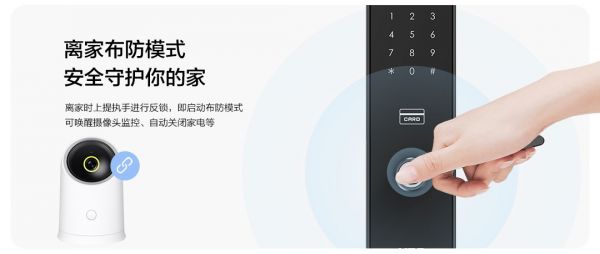 举家旅行,因公出差,把家交给它也放心。出门前上提外门把手开启离家布防模式,家中正在运作的智能电器立刻停止工作,而布置在家里各个角落的智能摄像头将开启防护模式,默契配合守护家的安全。