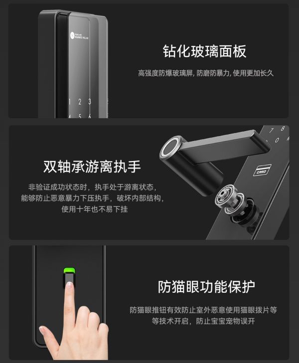 门锁作为居家入户的基础安防系统,安全永远都被摆在第一位,而这款荣耀 VOC智能门锁X6可以说是将安全这一属性融入到产品的每个细节。指纹模组一对一加密绑定杜绝假指纹,多重电子防护的锁体有效防止“小黑盒”,分段式双轴承执手能够防止暴力拆卸... ...这一切精心选材的背后就是为了给家和家人更好的保护,让用户用得更安心。