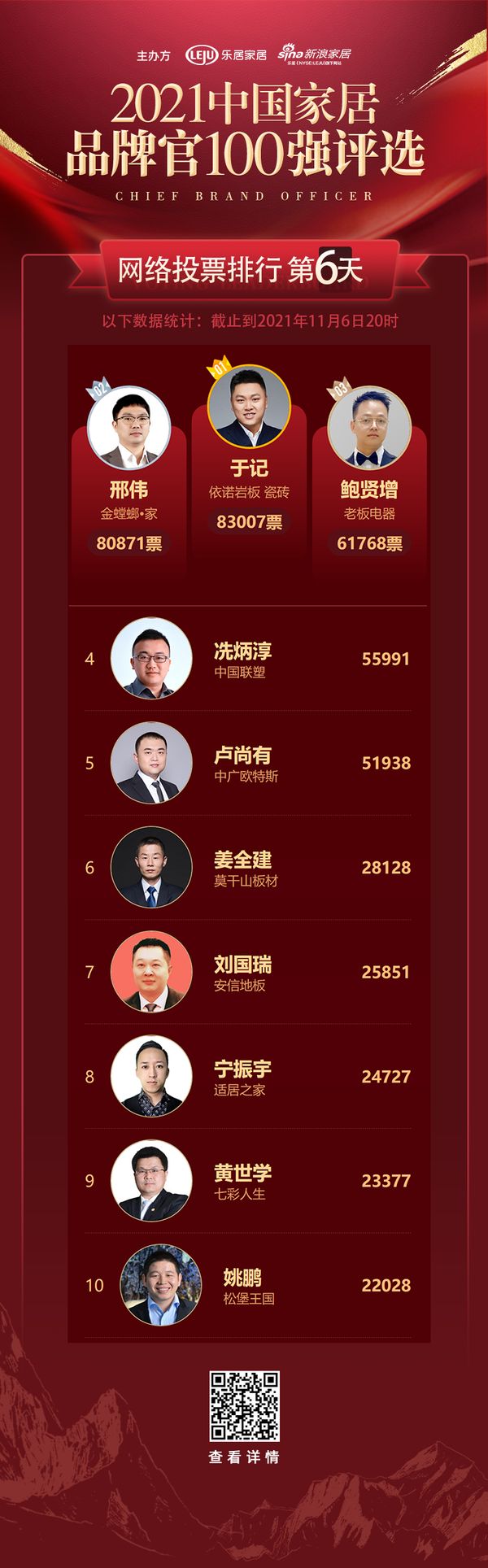 票选进入第六日,赛程已经过半,累计的有效总票数呈指数增长,截止11月6日20时,获得的有效票数超206万票,依诺岩板|瓷砖北京分公司总经理于记守擂成功,以83007票蝉联榜首,自投票通道开启以来,于记五次荣登排行榜首位之位。第二位是金螳螂·家副总裁邢伟,以80871票连续两日暂居第二位,第三位是老板电器家装事业部总经理鲍贤增,以61768票由此前的第四位上升至第三位,前十榜单的第三位和第四位再次互换位置。