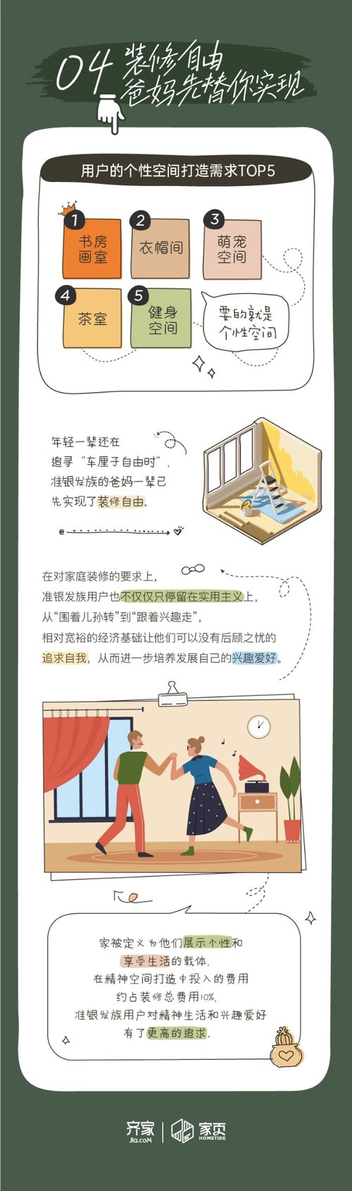 其次是装修理念,准银发族的装修自由不仅仅是想用什么材料就能买得起那么简单,他们的理念不再停留于实用主义,而是实现了从“围着儿孙转”到“跟着舒适走”、“跟着兴趣走”的转变。比如约81%的“老夫老妻”选择分房居住,主要目的在于提升睡眠质量,因此他们的家装理念更加理性、独立;再比如他们在精神空间打造中投入的费用可以达到装修总费用的10%,书房、画室、衣帽间、萌宠空间、茶室、健身空间是报告中准银发族的个性空间打造需求TOP5,准银发族用户对精神生活和兴趣爱好有了更高的追求。