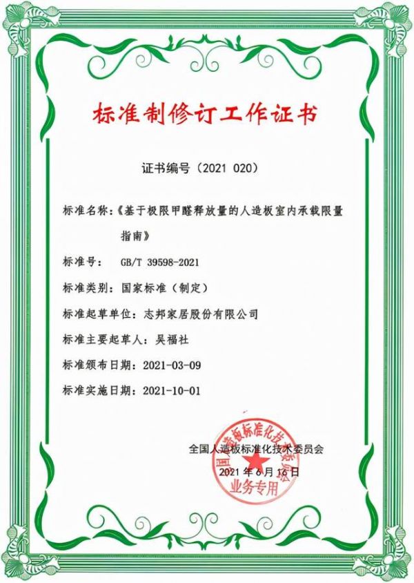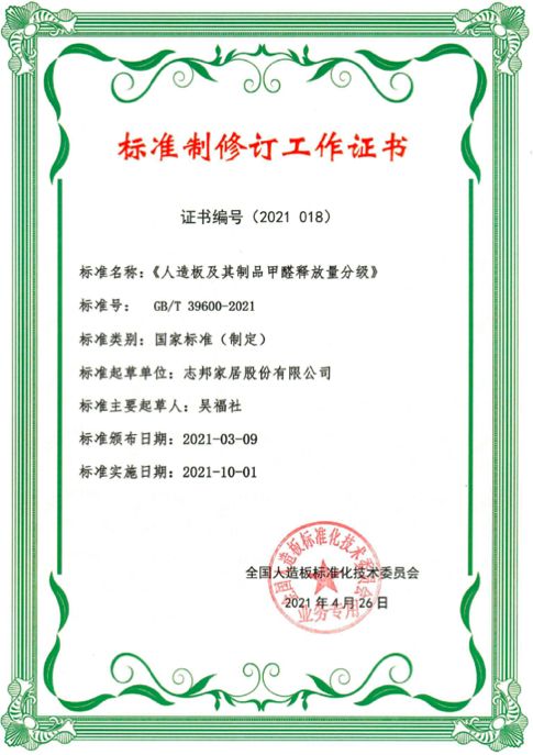 导语:2021年10月1日起,GB/T 39600-2021 《人造板及其制品甲醛释放量分级》和GB/T 39598-2021 《基于极限甲醛释放量的人造板室内承载限量指南》两项新国标开始正式实施。这两项国标,远超当前世界上很严格的美国NAF和日本F4星标准,开创了全球人造板工业环保新高度。志邦家居作为的起草人,深度参与了两项新国标的制定。