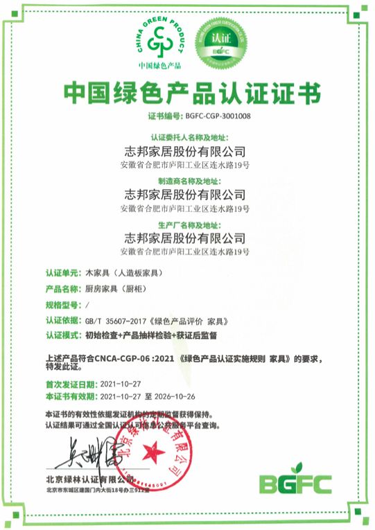 国家认可,志邦家居行业内率先通过中国绿色产品认证