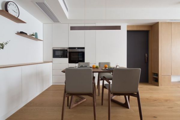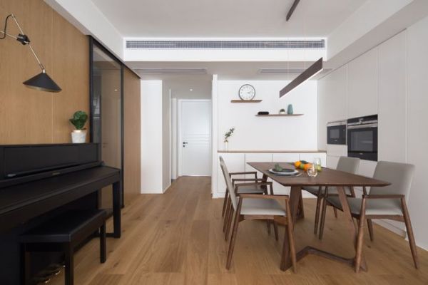 入户的第一个区域定制了浅色原木收纳柜~与深灰色的门竟也是很时尚的一个搭配~而餐厅也同样是以白色加浅色原木进行装饰,简约又时尚,并且特别的耐看~