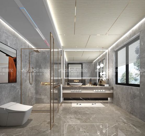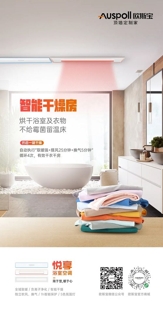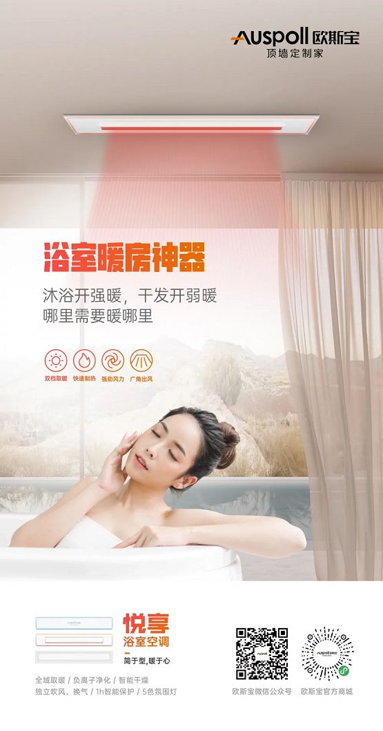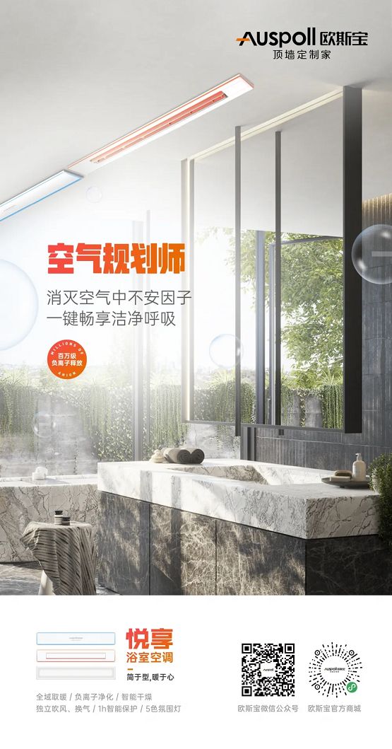欧斯宝悦享AB·浴室空调搭配无界系列-极简定制大板,融合空间美学与智能电器于一体,提升整体浴室空间的氛围和舒适体验,打造顶部空间家居结合艺术,让生活更智能,让浴室更舒适,好顶要配好电器,“大板”无边界,“悦享”新生活!