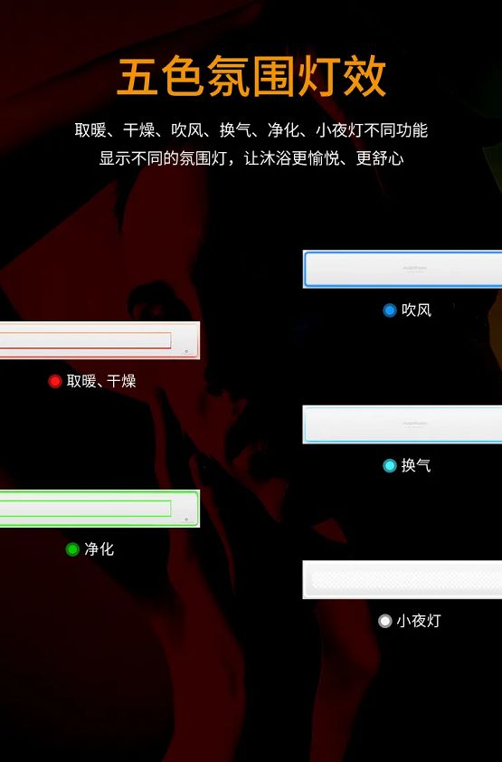➤五色氛围灯照明指示, 取暖、干燥、换气、净化、小夜灯不同功能显示不同的氛围灯,让沐浴更愉悦、更舒心;四重保护,贴心呵护,杜绝沐浴安全隐患。