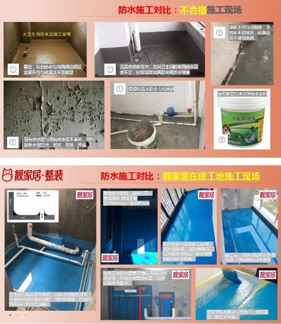 ,专业交给我,作为具有20年发展历史的整装连锁品牌,靓家居参编了《住宅室内装饰装修工程质量验收规范》行业标准,跟着标准来检查施工,帮助第一次装修的业主朋友们成功避坑。如水电线管的布管要如何走向,管与管之间留多大的间距,强弱电如何区分布线?防水要刷多少层?高度要多高,怎样才会不渗水?如果工人手法不过关,就会造成严重的安全隐患。而靓家居在施工制定了118道施工工序,工人按照工序施工,缺一不可。那么,装修里的隐蔽工程,比如水电、防水怎么避坑,哪些才是合格的工地施工标准?这里用两图对比,可以清晰判断不合格的防水和标准防水的做法。靓家居始终以客户的满意度为中心,教育消费者装修要从《整装6大标准》做比对,专业的事情交给靓家居,简单的事情留给业主,让业主感受到“原来装修就是这么简单!”
