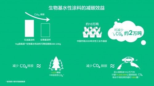 据推算,使用1公斤绿美源®生物基水性涂料,与石油基水性涂料相比,可减少200-230克碳排放。以2020年的家具市场规模估算,中国水性工业木器漆为10万吨,如果全部采用生物基水性涂料可整体降低碳排放2万吨,相当于约110万棵树1年时间吸收的二氧化碳,或约等于一辆百公里耗油10公升的汽车行驶7400万公里的碳排放量,减碳效果不容小觑。