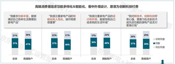 随着消费者对品质生活需求的提升,用户对家电需求正从功能消费向品质消费转变。据《白皮书》显示,智能化和人性化是高端消费者关注的核心要素,操作简便的家电具有更优质的使用体验,能够更好的提升生活品质。同时,设计和外观也是用户关注的重点,在颜值至上的时代,装饰生活环境也是疏解身心、提升生活品质的有效途径。