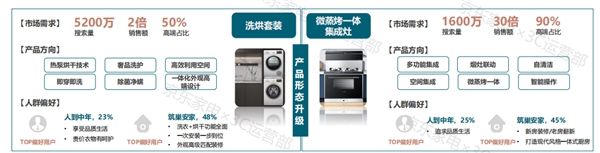 除此之外,套系化、细分化也正在被消费者所青睐,根据京东家电数据显示,洗烘套装在京东家电的搜索量达5200万次,高端产品占比为50%;微蒸烤一体集成灶的高端化趋势更为显著,在1600万的搜索量中,高端占比达90%,品质化需求可见一斑。