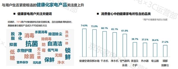 随着生活水平逐渐提升,健康话题得到高度重视,特别是在疫情发生后,让家居环境更加健康安全成为越来越多人的选择,因此各类带有除菌杀毒功能的电器产品都进入了消费者的购物车。《白皮书》显示,78%用户对健康家电的接受度较高,且在选购家用电器时, 具备健康功能的产品成为不可或缺的关注。此外,在众多家电品类中,消费者对于健康空调的认知度最高,能时刻为室内增氧换气的新风空调就是备受青睐的产品之一;其次为能够保持食材新鲜、锁住营养的保鲜冰箱,以及能实现衣物除菌、解放阳台的干衣机。由此可见,在日常生活中,大家对于健康家电的需求已延伸至方方面面。