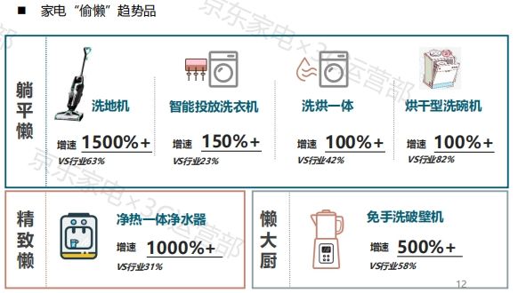 生活节奏的加快,让大家越发觉得时间可贵,因此,“懒系”电器持续走红。据《白皮书》显示,能解决传统地面清洁先扫后拖费双倍时间精力问题的洗地机,多档水温、方便每个家庭成员随时使用的净热一体净水器,以及具备自清洁功能、不用手洗的免手洗破壁机等清洁、厨电品类的“偷懒”趋势品在京东家电的增速均有不同程度的增长,最高增速可达1500%+,“偷懒”已然成为普世需求。