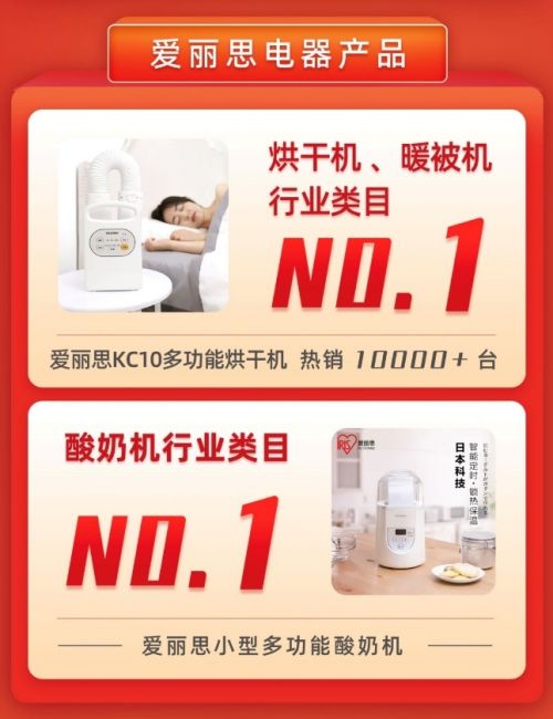 爱丽思在家用电器领域也取得了开门红。其中,在日本本土销量突破500万台的爱丽思多功能烘干机系列产品,在双十一前三天热销万台以上,以综合热卖指数9.9高居天猫干衣机热卖榜之首。该产品使用方便、易于收纳,暖被干衣、烘鞋除螨,一机多用,四季皆需。此外,爱丽思酸奶机也因机身小巧、操作简便及高性价比,获得消费者青睐。