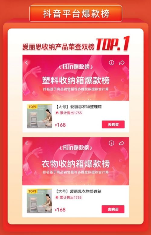 在天猫榜单之外,爱丽思同时荣登抖音平台塑料收纳箱爆款榜、衣物收纳箱爆款榜首位,在多平台、多维度显示出十足的竞争力。