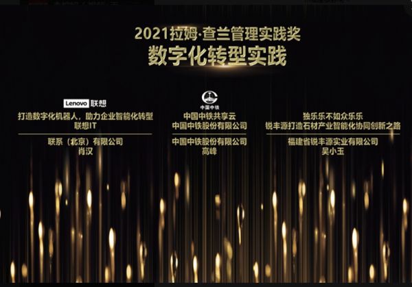 获奖名单中,包括联想、中兴通讯、富士康、平安、首钢、劲霸、海尔、万达等各领域的翘楚企业。值得骄傲的是,在这样盛大的评选活动中,终于看到了石材企业的身影。由锐丰源打造的“石材产业智能化协同创新之路”荣获数字化转型实践奖。这是有史以来石材行业首家也是唯一一家获得拉姆·查兰实践奖的企业。