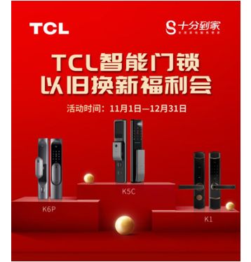 十分到家举办智能门锁以旧换新福利会,用户的旧锁不论好坏、不论品牌,一律可抵扣300元,TCL智能门锁单台最高补贴1500元。