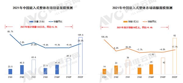 对于未来,奥维云网给出的数据推测是:2021年中国嵌入式整体市场销量规模预计销量133万台,同比增长5.2%;同时销售额规模预测,2021年预计78亿元,同比增长9.4%:嵌入式整体预计仍将四季度小幅下滑,全年保持正增长态势。