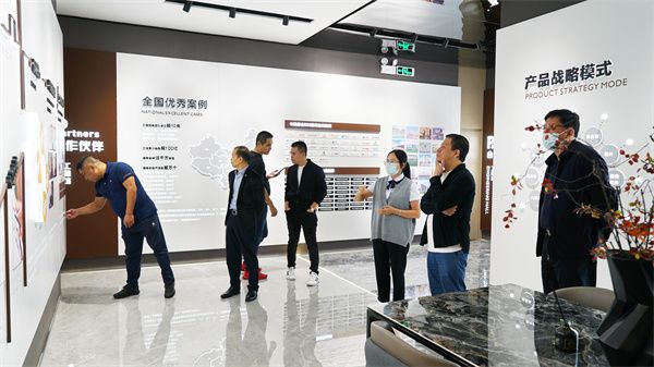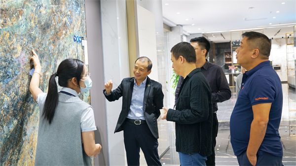 考察交流中,何董一行通过参观欧神诺【星云幻境 水木清华】2022八大系列雅奢新品元素及原创的空间应用,对欧神诺专注设计原创和技术创新,以及引领瓷砖材质设计潮流趋势的创新力有了深入的了解。