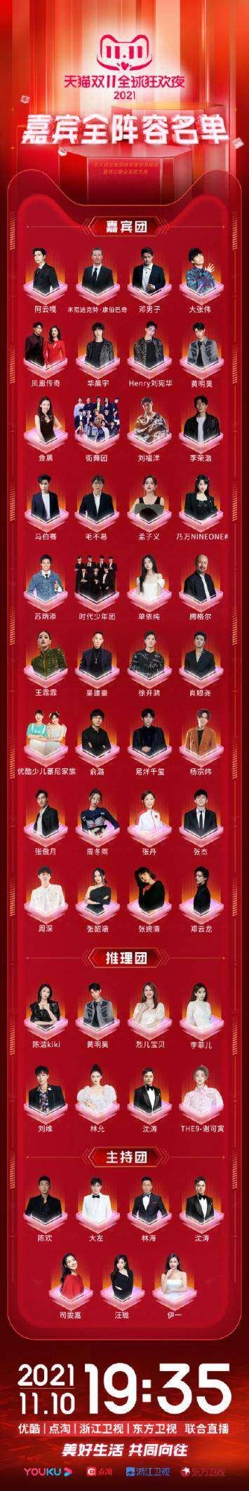 本次的天猫双十一狂欢盛典将在2021年11月10日正式举办,将由优酷、浙江卫视、东方卫视联合举办 ,本次晚会的举办地点位于上海的梅赛德斯奔弛文化中心,如果想要前往现场观看演出,那么可以在相关的购票APP上进行下单。说完了本场晚会的举办时间地点,下面咱们再来了解一下本场晚会的参演嘉宾都有哪些吧!