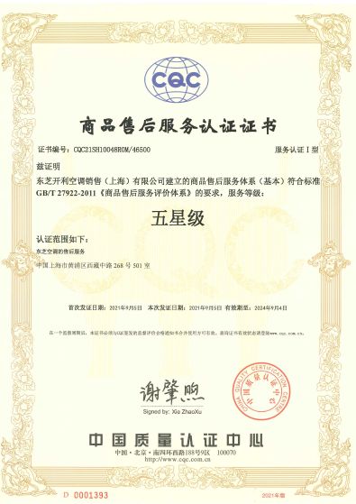 东芝空调商品售后服务认证证书-五星级