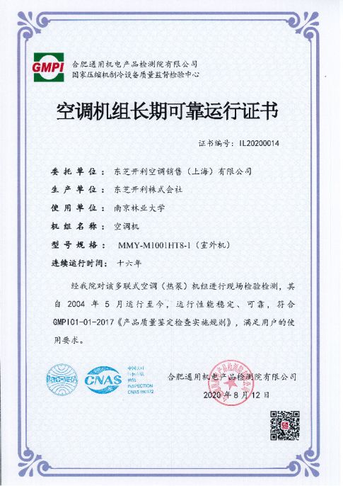 东芝空调机组在南京林业大学连续运行16年长期可靠运行证书