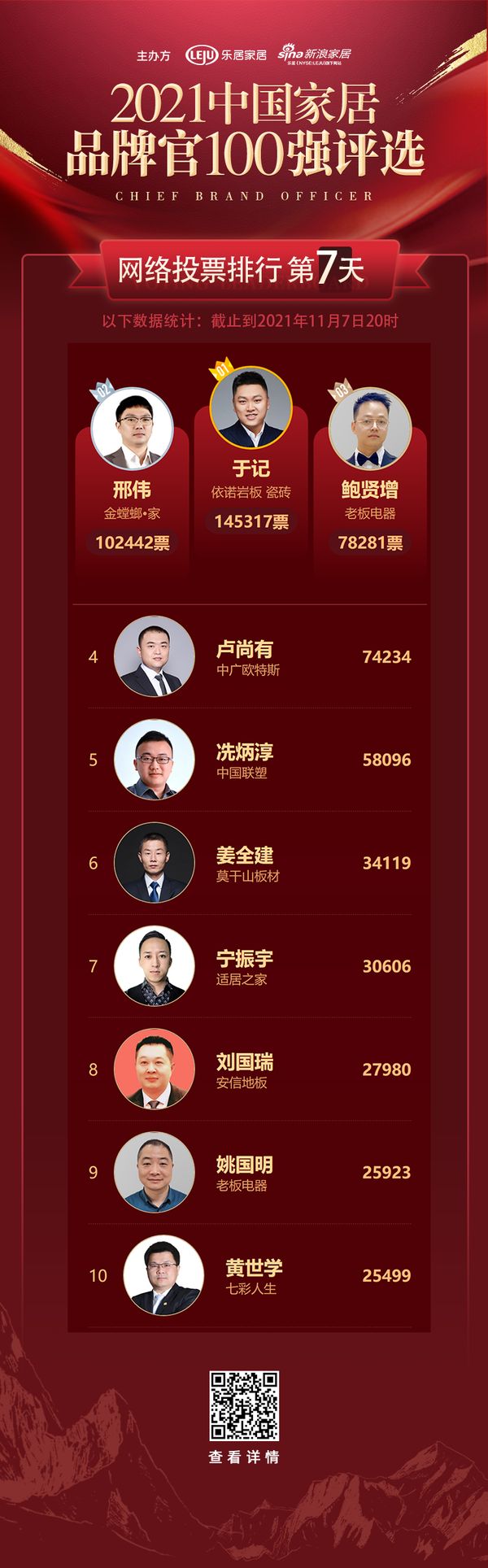 第四位至第十位的是:老板电器家装事业部总经理鲍贤增(109472票)、 中国联塑市场与品牌管理中心总监冼炳淳(62347票)、莫干山板材总经理姜全建(46431票)、适居之家总经理宁振宇(41064票)、老板电器大客户总监姚国明(34460票)、 泰普尔(中国)副总裁邵堰南(33875票)、安信地板市场部总经理刘国瑞(32236票),泰普尔(中国)邵堰南由第十位上升至第九位,和安信地板刘国瑞互换位置,前十位品牌官无任何人员变动,票选即将结束,是否有新的变化,拭目以待!