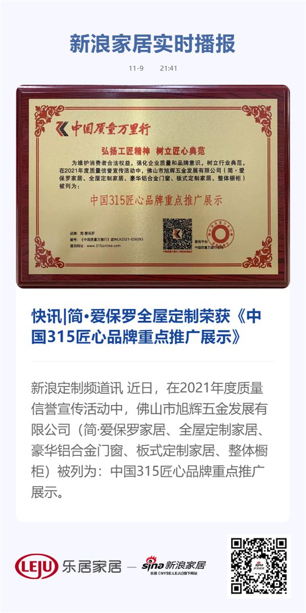 新浪定制频道讯 近日,在2021年度质量信誉宣传活动中,佛山市旭辉五金发展有限公司(简·爱保罗家居、全屋定制家居、豪华铝合金门窗、板式定制家居、整体橱柜)被列为:中国315匠心品牌重点推广展示。