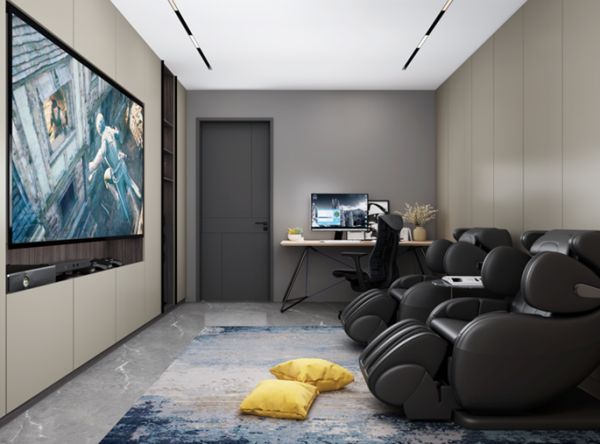 在柏厨“曼居”宽敞的多功能房里,可以轻松地加装投影和音响设备。观赏影视剧的时候,环境光线会对画质产生较大的影响,“曼居”选择了适宜的补光和遮光设计,既有助于家人视力健康,又可改善影音感受。液晶电视与音响器材安置在一侧的机柜里,这样巧妙的设计非常美观,整个影音空间看上去似乎有些未来科技感。而浅色的电视背景墙和地毯又为冷酷的空间增添了一抹亮色,同时地毯铺设于主音箱与听者之间地面,使音效更为完美。两侧机柜带有隐藏灯具,非常有特色,为整个影音室增添了一分活力。搭配与电影院类似的可调灯光,可以方便的控制明暗效果,同时摆放两张舒适的影院椅,使人眼在整个观影过程中更为舒适,这样的设计赢得很多年轻人的喜欢。