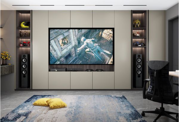 暧昧的灯光中,男女主人偶尔对视,偶尔牵手,享受沉浸式的观影体验,伴随多巴胺的分泌,爱在升温。一侧的电脑桌又为空间增加了另一种可能,男主人在王者、魔兽;妈妈可以煲着浪漫的韩剧,而牙牙学语的小朋友在脚边的地毯上搭着积木,互相陪伴。或是,仅仅播放着或安宁轻松、或脍炙人口、或可爱稚气的音乐,柔和灯光下,一家人坐在地毯上看书、绘画,享受心灵的的净化。