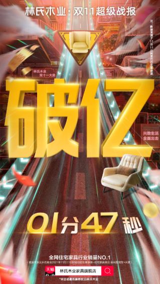 1分47秒破亿7分48秒破2亿 林氏木业打响双11第二波头炮