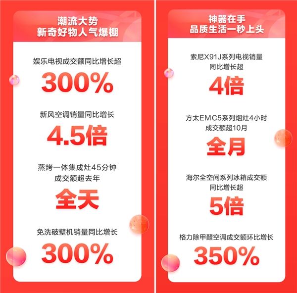 时间留给家人,居家更要自由。广受有娃家庭钟爱的分区洗洗衣机,因能有效避免衣物洗涤时细菌交叉污染问题、呵护宝宝健康,成为洗衣机市场的趋势产品。能扫地拖地二合一、一次解决地面清洁问题的洗地机深得养宠一族的欢心。还有具备自清洁功能、不用手洗的免洗破壁机4小时销量同比增长300%。当然,能为人们节省更多时间、带给大家焕新生活体验的尖货好物远不止这些,截至11日0时,索尼X91J系列电视销量同比增长超4倍;方太EMC5系列烟灶成交额超10月全月;海尔全空间系列冰箱成交额同比增长超5倍;格力除甲醛空调成交额环比增长350%。这些家电产品都是我们在追求美好幸福生活中的“贴心管家”。
