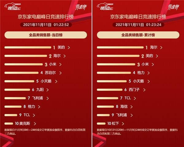 同时,“京东家电巅峰日竞速排行榜”也记录着各品牌在11.11你追我赶、一竞高下、争夺榜首的盛况,因为在这个没有硝烟的“战场”,看似简单的登榜排名背后是亿万消费者对产品和品牌做出的选择与支持。目前,美的和海尔凭借硬实力分别登上全品类销售额当日榜和累计榜的“王者之位”,成为现阶段广大消费者最为青睐的品牌。不过11.11仍在继续,终局桂冠花落谁家还未成定局。