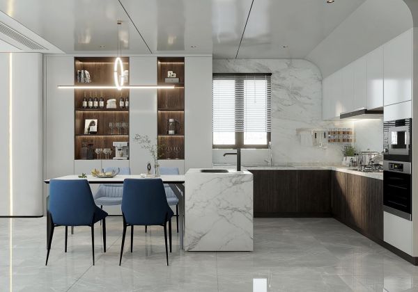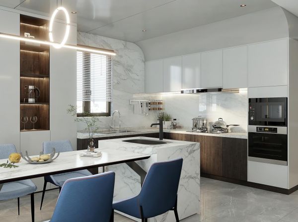 独立岛台延展出餐桌,纤细的桌腿、椅腿为空间增添精致感,看起来更宽敞。后方靠墙设立餐边柜,以用岩板、木质、大理石做组合,既能储物也能展示收藏的红酒,配以颇具设计感的吊灯,营造了精致优雅的用餐氛围,巧妙地提升了居室格调。