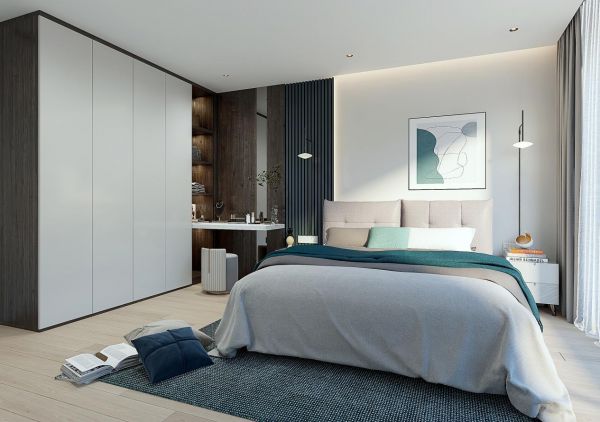 为避免空间过于素雅,设计师以跳跃的墨绿色格栅板做点缀,加上颇有设计感的挂画、床品,给卧室增添了一丝复古感,衣柜和床头的竖向线条也从视觉上拉伸了层高,看起来更大气美观。
