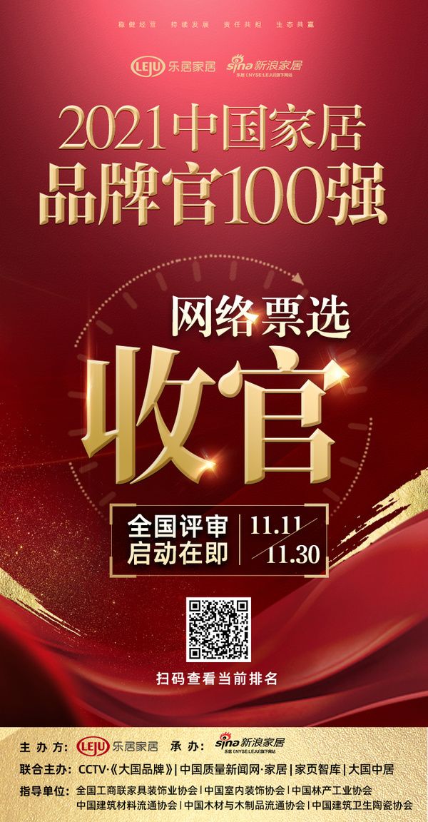 11月1日,由乐居家居主办、新浪家居承办,由CCTV·大国品牌、中国质量新闻网·家居、家页智库、大国中居联合主办,全国工商联家具装饰业商会、中国室内装饰协会、中国建材流通协会中国林产工业协会,中国木材与木制品流通协会共同指导,「2021中国家居品牌官评选」于11月1日正式进入投票环节。