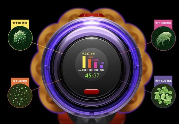 当然吸引我的一点是它的激光探测技术,这是我在其他吸尘器中都没有看到的一点。采用了绿色的二极管,绿色在人眼识别下比红色更亮,照射也更集中。可以说,戴森V12使地面上隐藏的灰尘显现出来,让清洁变得“可视化”了。当吸入更多灰尘时,LCD 显示屏上的柱体也会快速上升,能让你客观地知道不同吸入颗粒物的数量及大小,并得知哪一个区域的哪种灰尘更多,也能进一步确认,那里的灰尘是否被吸除干净。这种功能太适合有洁癖的朋友了,能够有效吸附霉菌、尘螨,有了这个激光探测技术,让打扫变得更加轻松了。