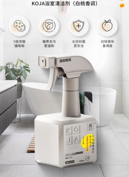 KOJA浴室清洁剂不但在产品设计、香味这些细节满足消费者对美好浴室环境追求,而且在清洁实力方面同样让广大消费者心服口服。它采用日本进口APG+进口酵素双重清洁成分和蛋白酶强分解5倍高浓度配方,生物酶破坏污垢中的蛋白质结构,高效分解浴室污渍,将花洒、水龙头、浴室玻璃上沾染的水垢一网打“净”。并且,它可以减少对器物的损伤,不同于常见的强酸性清洁剂,这款KOJA清洁剂添加护肤品级原料,温和无刺激,环保可降解。